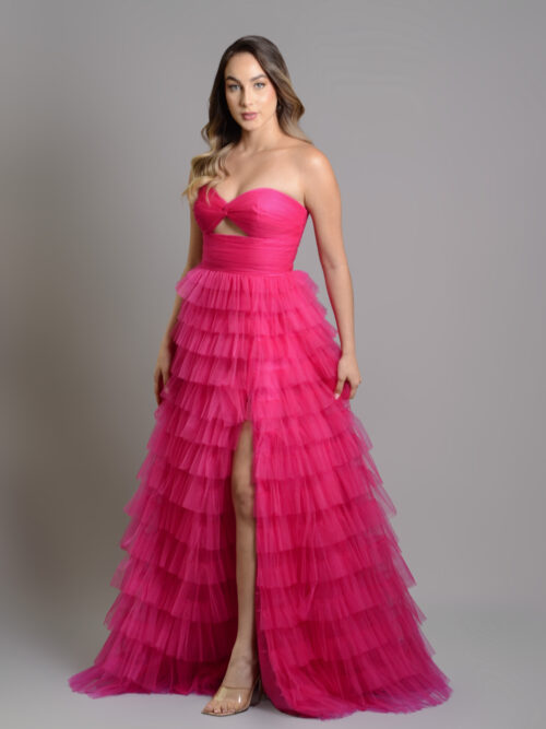 Vestido de quinceanera morado con detalles de flores y cola larga