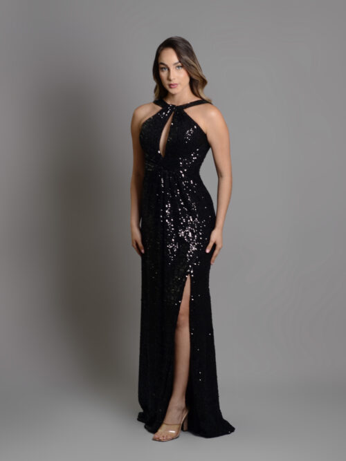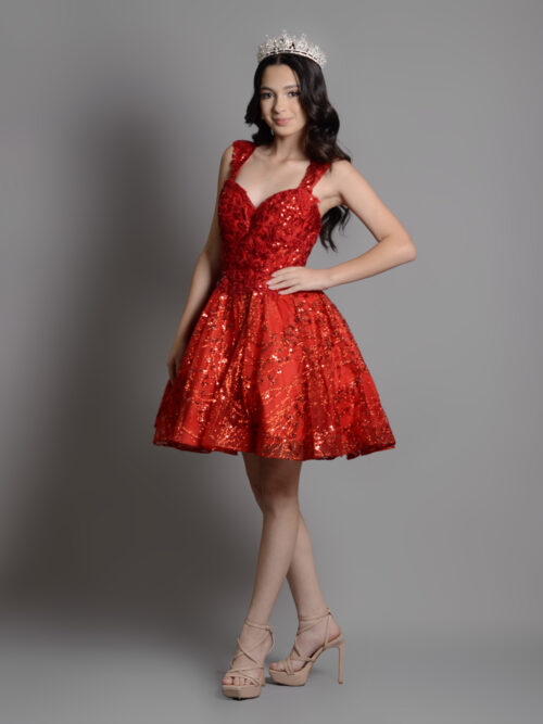 Vestido azul de Tiritas con detalles de flores escarchadas y trenzado por la parte de atras