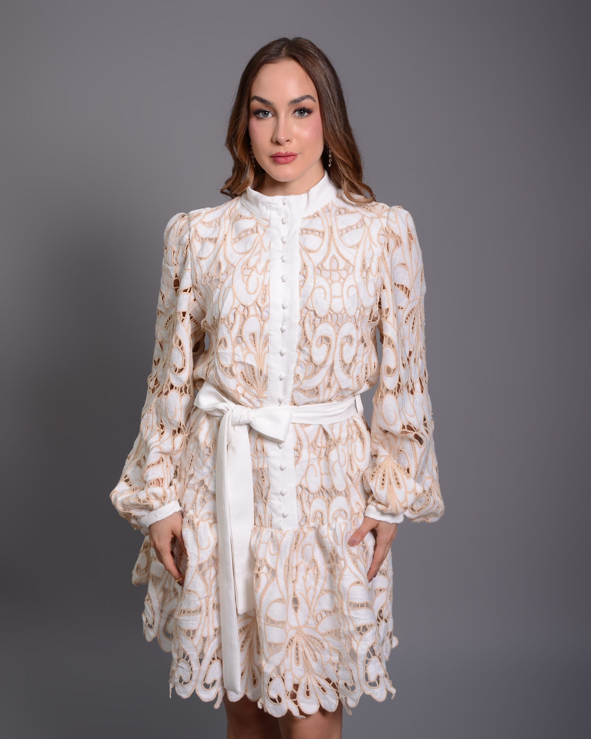Vestido corto manga larga con cinturón
