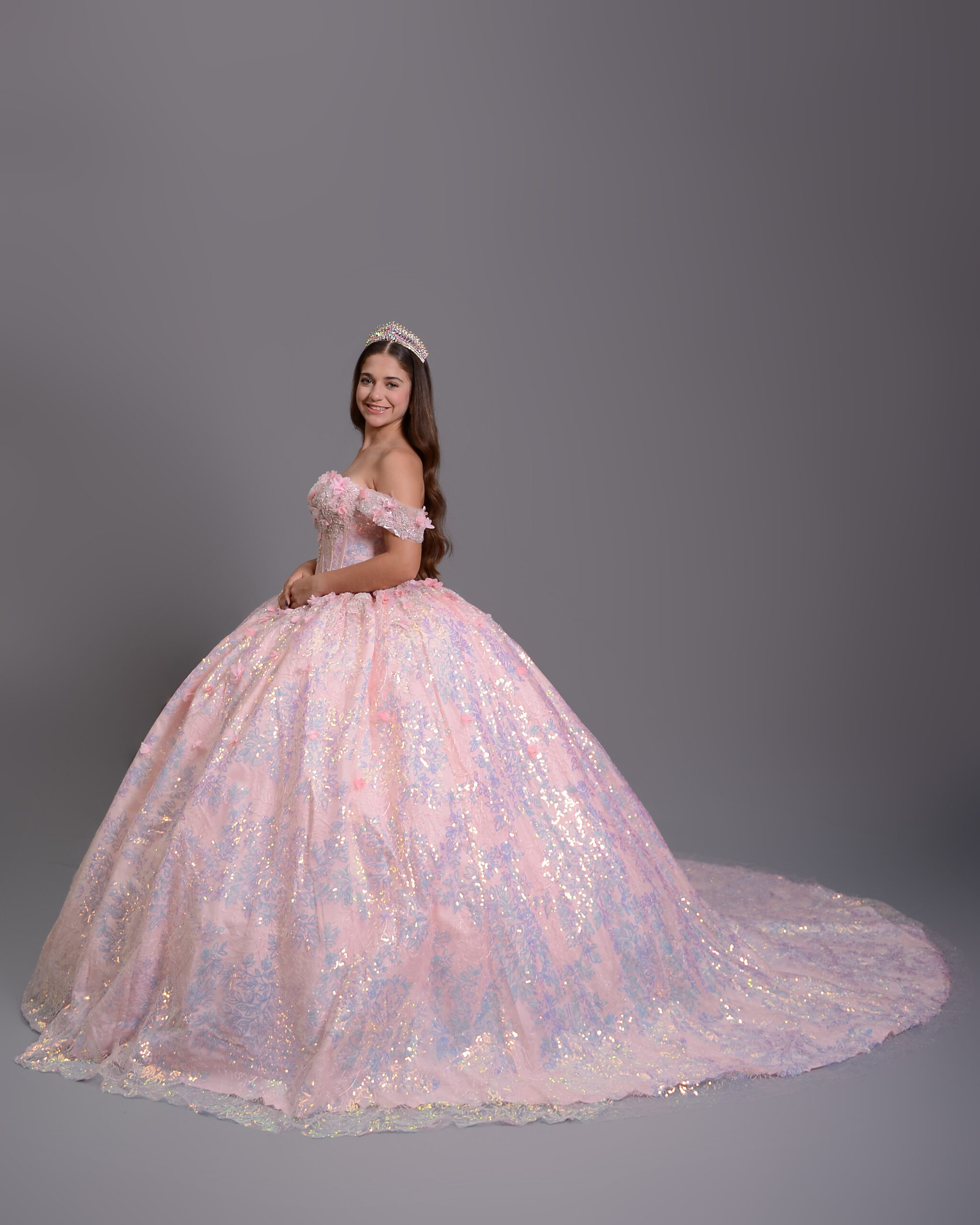 Vestido de quinceañera corset con flores y lentejuelas tornasol